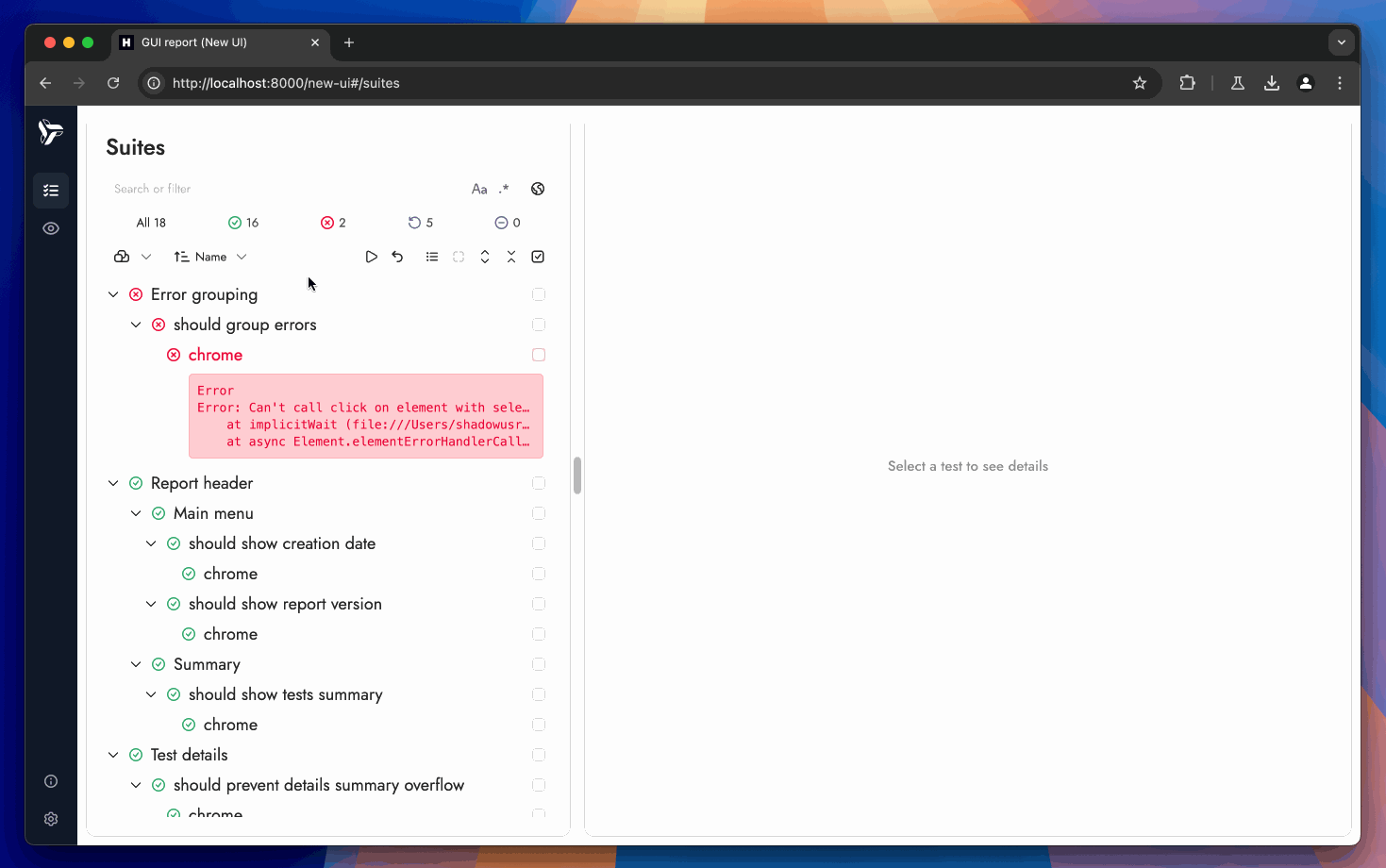 - Больше, чем просто отчет: это не статический отчет — вы можете запускать свои тесты, обновлять эталонные изображения, анализировать прогоны тестов и многое другое.