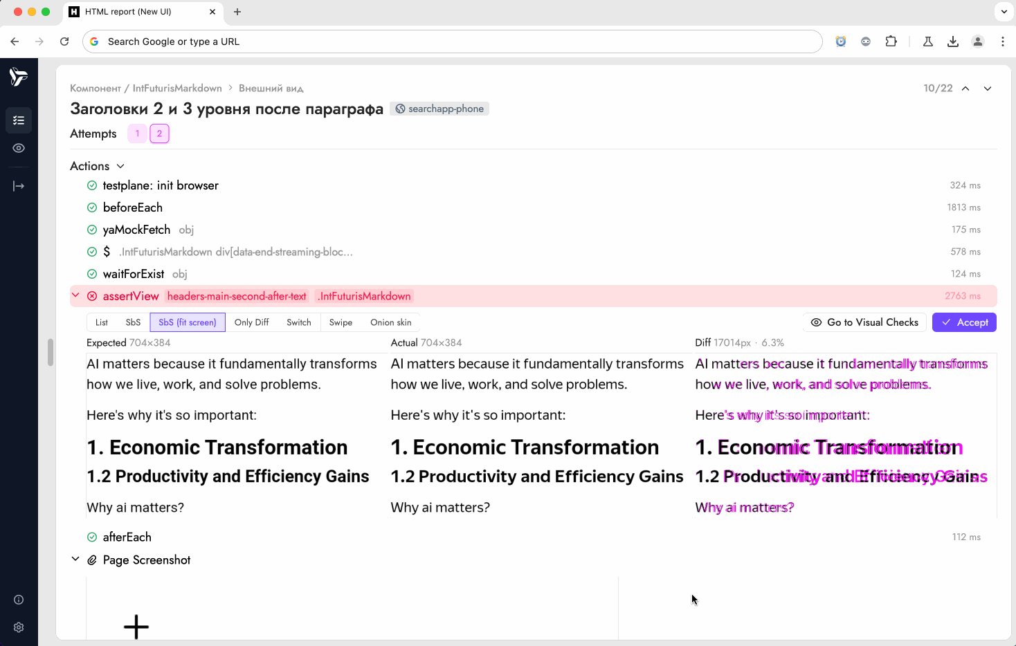 Данная функция позволяет ревьюерам приниматьть новые эталонные скриншоты прямо из статического HTML-отчёта, опубликованного в CI (например, в S3 или на внутреннем веб-сервере). Интерфейс выглядит примерно так: